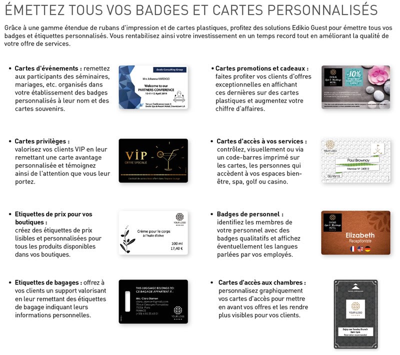- Bibliothèque de plus de 200 modèles d'étiquettes pour l'hôtellerie et la restauration (étiquettes de buffet, cartes d'évènement, promotion, VIP, carte de chambre, service et loisirs, boutique, étiquette badge, badges employés, cartes de visite, carte de déplacement, carte de signalétique) et formats (carte longue, format carte bancaire, paysage, portrait, pliées, sécables).